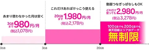\ 20GB以上はどれだけ使っても3,278円!無制限最安値は楽天モバイル/