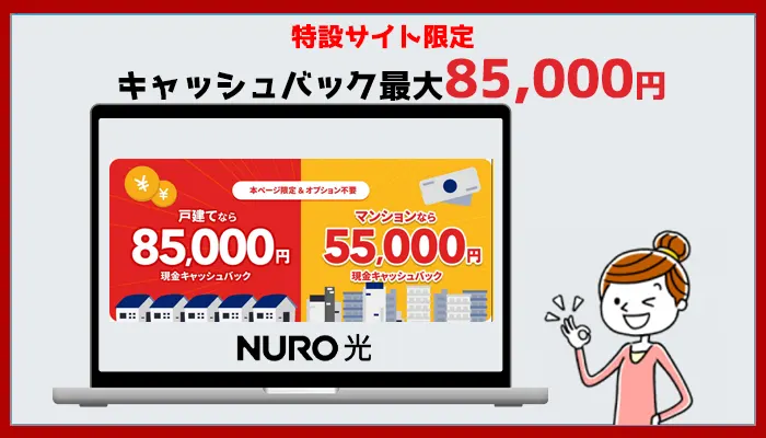またNURO光はキャッシュバックも戸建ての場合85,000円、マンションでも55,000円と高額です。