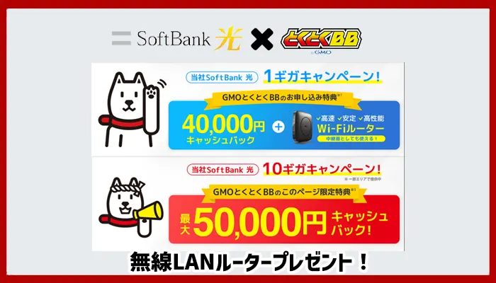 ソフトバンク光は申し込み窓口によるキャッシュバック額の違いはほとんどありませんが、GMOとくとくBBからソフトバンク光を申し込むと無線LANルーターがもらえます。