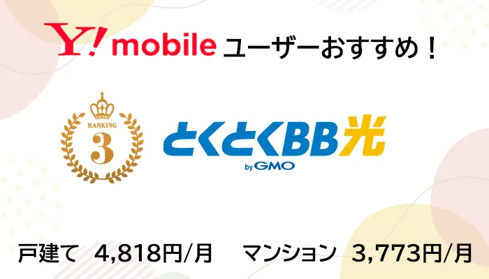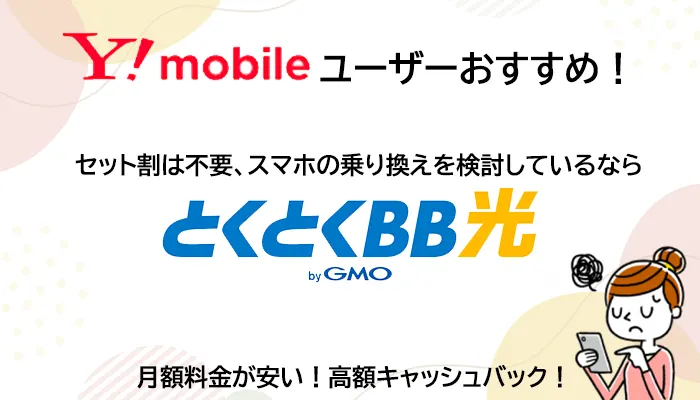 ワイモバイルユーザーであればセット割の適用で通信費を節約できますが、スマホを他社サービスに乗り換えることも検討しているのであれば、さらに月額料金の安いGMOとくとくBB光がおすすめです。