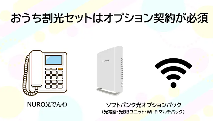 注意点としてNURO光もソフトバンク光も、おうち割光セット(A)の適用には指定オプションサービスの契約が必須です。