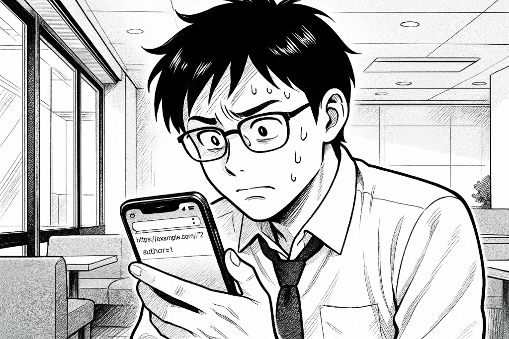 そう、URLの中に、あなたのログインユーザー名が、堂々と表示されてしまっているんだ。これは、WordPressが自動的に生成する「投稿者アーカイブページ」の仕様。?author=1の「1」はユーザーIDで、これを2, 3, 4…と変えていけば、他のユーザーのユーザー名も全部バレてしまう可能性がある。